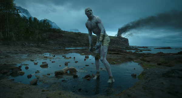He uses the wraparound story of a Royal Danish Navy expedition to the North Pole that’s now stuck in the ice. The crew sees an explosion nearby and discovers injured Victor Frankenstein (Oscar Isaac, THE CARD COUNTER). Captain Anderson (Lars Mikkelsen, of the Copenhagen Mikkelsens) takes him on board to shelter him from The Creature (Jacob Elordi, THE MORTUARY COLLECTION), and this strange guest decides to be dramatic and tell his whole damn story from childhood to that very day.