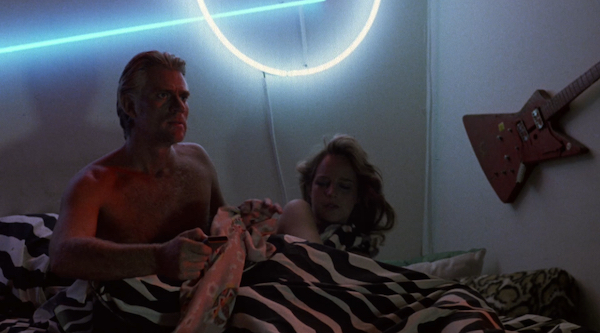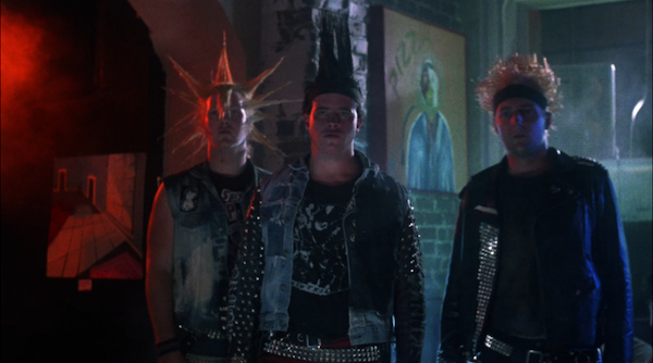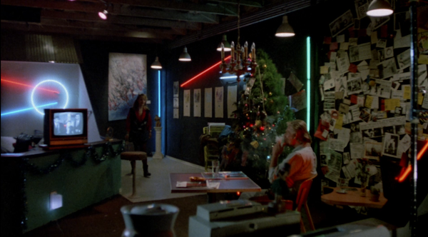 In they meantime they hide out at Lena’s friend’s place, which is located above a punk club and kind of looks like it could be a bar. I like that it has that minimalistic neon art most cool ‘80s movie lofts have, plus an electric guitar hung on the wall like a decorative sword.