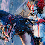 Which reminds me – I should mention the story. Jake decides that Spider has to go back to live with their nice earth scientist friends because it’s not safe for him to be out here with finite breathing mask batteries. The Sully kids all agree that “that’s bullshit!,” he’s a member of the family, so as a compromise Jake and Neytiri agree that the whole family can go on the trip to drop him off. They convince Peylak (David Thewlis, THE ISLAND OF DR. MOREAU) of the Wind Traders to let them fly with his convoy even though they’re wanted terrorists. But the family are separated when the ships are attacked by raiders from the Mangkwan, a.k.a. Ash people, a tribe who live on a volcano, wear cool red and white face paint and reject Eywa. Death metal Na’vi,