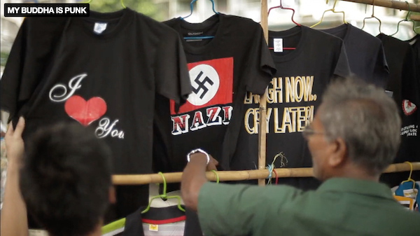 I’m watching this with almost zero context of Myanmar’s larger culture, let alone punk’s place within it, and this is not the type of documentary that does any explaining beyond a little bit of text at the beginning. But that’s my preferred form of documentary: the kind that just drops you in to try to figure out what you can about what you’re witnessing. I had a little trepidation because they use the words “skinhead” and “oi,” which can have white power/far right connotations in the west, and then one of them is reading a book with a big photo of Hitler on it. I knew there were different ways to interpret this but sure enough there is a fascination with Nazi imagery for some people in Myanmar at this time – one scene shows a non-punk guy in a street market trying to decide between two different swastika t-shirts and one that just says “I ♥ YOU.” I can only guess what that’s about.