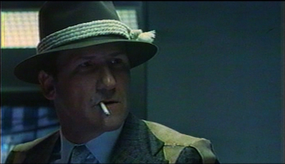 In Angel City in the future, McNulty is the only man they trust to oversee the transfer of a dangerous prisoner, Edlin Shock (Velvet Rhodes, “Hooker” [uncredited], BATMAN FOREVER). I’m not sure why – maybe they like the rope he ties around his fedora? He doesn’t do anything unusual for the transfer, just walks along, turns his back and then she just kicks some guards and escapes into the ceiling. Really a huge failure that everyone should be ashamed of, an absolute fiasco, I gotta assume none of these people will have jobs still by part 2.