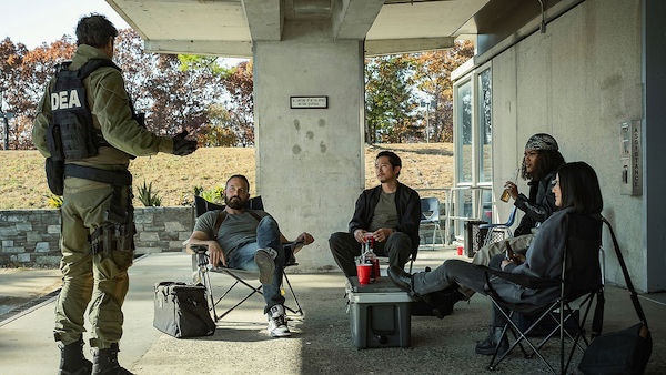 Lieutenant Dane Dumars (Matt Damon, THE GREAT WALL) has assumed leadership of the team, which also includes detectives Mike Ro (Steven Yeun, OKJA), Numa Baptiste (Teyana Taylor, ONE BATTLE AFTER ANOTHER), and Lolo Salazar (Catalina Sandino Morena, BALLERINA: FROM THE WORLD OF JOHN WICK). At the end of their shift they hang out in the parking lot drinking, barbecuing, playing dominoes, doing donuts with their sports cars and front wheelies on their motorcycles. Some of their DEA agent buddies, Nix (Kyle Chandler, FIRST MAN) and Reyes (Jose Pablo Cantillo, REDBELT), stop by in a tank and stand around with their thumbs hooked into their kevlar vests as they bust each others’ balls and gossip about the murder investigation. I think this is definitely in that category with BACKDRAFT and BLOWN AWAY, movies absolutely in awe of macho guys in a stressful job bonding after work. But I think there’s also a hint of THE FAST AND THE FURIOUS, which I mean as a compliment.