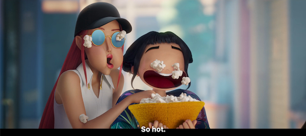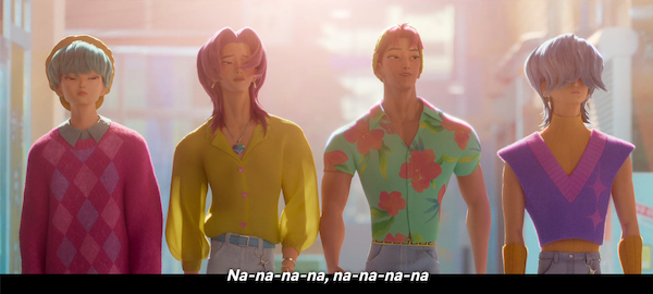 The Saja Boys show up out of nowhere and cause a scene by performing a catchy song in public and being aggressively dreamy/hunky. There are really funny uses of slow motion, soft focus and music. The Huntrix gals have instant crushes followed by competitive jealousy and plans to kill them because they’re obviously demons.