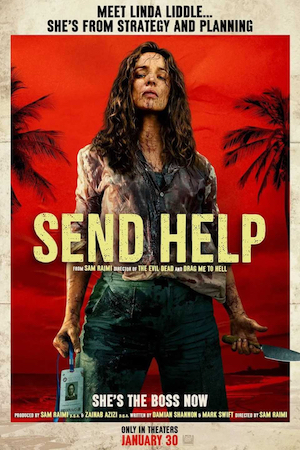 Sam Raimi is back! With a new movie. Not one of his best, but hey – we got a new Sam Raimi movie. SEND HELP was brought to him by screenwriters Damian Shannon & Mark Swift (FREDDY VS. JASON, FRIDAY THE 13TH 2009), but it follows part of the DRAG ME TO HELL template in that it’s about a timid woman who doesn’t fit in and gets overlooked and mistreated by the sexist assholes at her corporate job, then finds her inner viciousness to be able to compete with them. A difference is that in the earlier film the horror scenario comes as punishment for the shitty thing she does to get ahead. This one is about how getting stranded on an island with her asshole boss becomes her opportunity to unleash her mean side.