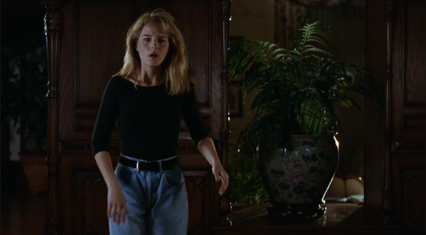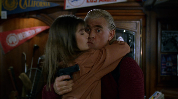 A new screenwriter, Jackson Barr (BODY CHEMISTRY, SUBSPECIES, ROBOT WARS, MANDROID) joins director Charles Band (PARASITE), but otherwise everybody is back. Tim Thomerson (between an episode of The Flash and an episode of Baywatch) is Jack Deth, the time traveling future cop now well established as an old-timey private eye in 1991 Los Angeles. Despite the subtitle he’s not returning from anywhere, he’s just sticking around in the same place. (And he beat BATMAN RETURNS to it by a year.) He’s married to Lena (Helen Hunt, a year before starting Mad About You) and they live in a mansion with Hap Ashby (Biff Manard, DESERT KICKBOXER), the former MLB player they saved from homelessness. In the intervening years Hap “made a pile of money” on “commodities speculation” and now collects firetrucks (?!).