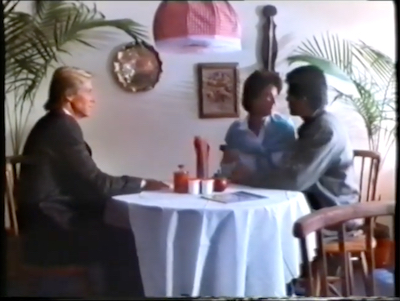In the next scene she’s attacked by the rapist, and it’s unclear but I guess she gets away by kneeing him in the balls. This leads to the not-so-shocking reveal that the rapist is Craig wearing a disguise. In the next scene he’s wearing a suit and tie on a lawnchair in his backyard holding a cat, and hears a radio report about Eve being attacked. Don also hears the news and they both rush to John’s Place and walk in at the same time. I like how Eve goes right to Don and embraces him while totally ignoring Craig, and then the three of them sit at a table together but Eve and Don cuddle and look into each other’s eyes all lovey-dovey as Craig angrily taps on the table and lies that the injuries on his hand are from his cat.