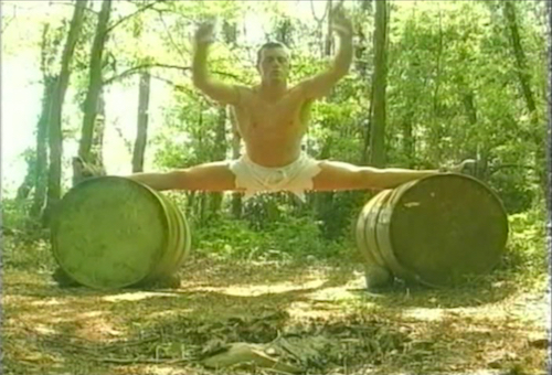 This is quite obviously a song in the key of JCVD, and they signal that right at the beginning when he’s looking at his wall of family photos and and there are a bunch of Van Damme 8 x 10s mixed in, at least one of them autographed. I’m not sure if that’s meant as an Easter egg or a character detail, but either way Bennett does the BLOODSPORT and KICKBOXER traditions proud with his training montages. He’s got shots of himself kicking on the beach, lifting big pieces of wood, doing pullups on a high branch, balancing on things, doing the splits. There are at least two specific homages to famous Van Damme moments: the kick stopping in front of the guy’s face from TIMECOP