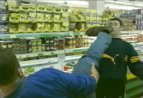 Jimmy’s talents include martial arts and happening to be there when some guy is harassing some lady. There’s a flashback to him being bullied as a child, as if we need an origin story for his hatred of bullies. (That’s also the reason his dad starts training him in martial arts. I guess it wouldn’t have occurred to him otherwise.) In the tradition of RUMBLE IN THE BRONX, he happens to be there when some grown adult scoundrels are running around a grocery store breaking eggs, eating things and knocking things over. They approach a female employee, Nicola (Nicola O’Sullivan), who has just finished stacking paper towels into an aisle display, and start hassling her. Jimmy appears and says, “You’re very brave to be harassing young women.” He kicks one of them, knocking over the paper towels, which I thought was really funny because I’d assumed that was what they were threatening to do.